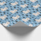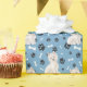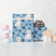 An image of a West Highland White Terrier Dog is the feature in the pattern on this all occasion gift wrapping paper. The dog sits amid a pattern of black paw prints and white bones, and is repeated on a medium blue background.