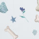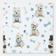 The design features white West Highland Terriers with various accessories in blue and black such as top hats, glasses, neckties, scarves and bones on a light blue background.