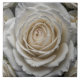 A close-up view of a white wet rose reveals its captivating beauty, with raindrops clinging to the petals, enhancing its freshness and purity. The dewy effect adds a sense of tranquillity and elegance to the delicate flower.