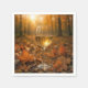 A glass of white wine rests among fallen autumn leaves in a sunlit forest, with the warm glow of the setting sun enhancing the golden hues of the scene