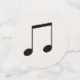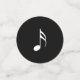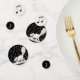This table confetti has large circles with a white winking cat walking on top of piano keys on a black background with white music notes. The medium circles are white with a black music note, small circles black with a white music note.