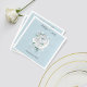 A small white dragon sits amongst white roses against a soft light blue background with delicate snowflakes.