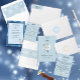 A small white dragon sits amongst white roses against a soft light blue background with delicate snowflakes.