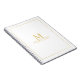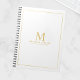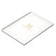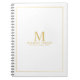 Professional notebook features custom monogram, name and text in gold classic serif font style with gold border on white background.