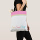 A pretty summer tote bag in white, featuring a top rim of pink orange and aqua . Colourful text of "Sun Sand Surf" included at the bottom. Customise to change text or add initials.