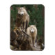 In a serene forest, two white wolves stand on a fallen tree stump, their fur muddied by recent rain. Despite this, their presence commands attention, exuding strength and grace as they survey their domain with alert eyes and poised stances.