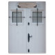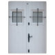 Stark white and black Mediterranean beach door with two barred windows and a latch.