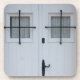 Stark white and black Mediterranean beach door with two barred windows and a latch.