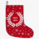 Cute white wreath and white abstract snowflakes pattern over red background- Holly Jolly. Customisable stocking template