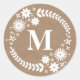 A sticker featuring an illustration of a white floral wreath. Personalise with initial at centre. Background is brown paper inspired. Look for matching wedding invitations and more at Jill's Paperie.