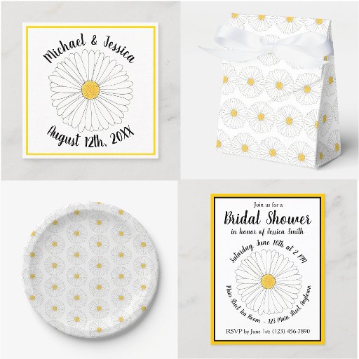 Design features an original marker illustration of a yellow and white daisy flower blossom. Great for a garden party, bridal shower, wedding or engagement.