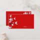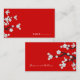 An original illustration of beautiful white cherry blossoms or sakura spring flowers with black branches on a classic red background. This is a modern double-sided wedding dinner reception place card / guest seating escort card.