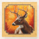 Portrait of a whitetail buck sporting trophy antlers, surrounded by the golden glow of autumn, and a sunny yellow patterned background. Realistic artwork created from an original oil painting by artist Crista Forest.