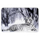 Beautiful white tiger with black stripes and blue eyes lying in the snow.