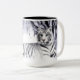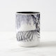 Beautiful white tiger with black stripes and blue eyes lying in the snow.