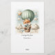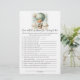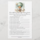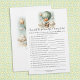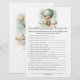 Adventure themed, "How Well Do You Know the Mommy To Be", baby shower game card with an adorable fox holding a teddy bear riding in a green hot air balloon. The watercolor green sky has white clouds with surrounding gold stars. Templates on back.