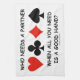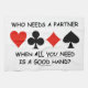 Wry suggestive and sarcastic attitude comes alive on any of these gifts featuring the four card suits and asks the following question: "Who Needs A Partner When All You Need Is A Good Hand?" Gifts for all bridge players who wish that they did not need a partner to play bridge and who understand that, sometimes, at the bridge table, it just takes a good hand to win!