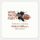 Score big with this energetic football-themed birthday Thank You sticker! With “Who Tackles Forty” boldly headlining the design in a sporty font and a football bursting from a splash, this sticker sets the tone for a fun, high-energy celebration. All party info is fully customisable. Great for celebrating 40—or any age you want to tackle in style!