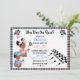 Humourous gender reveal invitation in a racing theme with girl & boy holding racing flags cheering on their gender for the finish line! Pink, blue, black & white chequered.