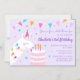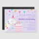 This fun birthday invitation design features a cute whimsical llama with a party hat eating a birthday cake with sprinkles and candles. There are also bunting decorations, and stars and confetti on a purple background. Personalise this invitation with your own text.