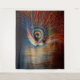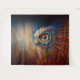 A highly detailed and colourful artistic depiction of an owl’s head against a background of vertical wooden planks. The owl features intricate patterns and vibrant hues, giving it a textured, almost mechanical appearance. Its large, deep blue eye stands out prominently amidst the orange, yellow, blue, and grey tones