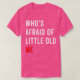 Whos Afraid of Little Old Me TShirt 14 .Funny, Family, Sports, Music, Education, Animals, Jobs, Names, Graphic, Tees Shirt, Funny Sayings, Vintage, Holidays, Gifts, party, souvenir, pride, vacation, clothing outfit apparel gift for Father's Day, Christmas, Birthday, Mother's Day, Anniversary, Graduation, Halloween, 4th of July, Retirement, St. Patrick's Day, Thanksgiving.