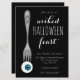 A chic and fun design for a party. This design features an image of an eyeball on a fancy silver fork on a black background. Three contrasting fonts are used and you can personalize the text to match your event. It says 'A wicked Halloween feast' which would be ideal for a Halloween themed dinner party or any evening event for adults or kids.