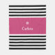 A modern wide horizontal stripes pattern fleece blanket in black and white and with a deep pink accent. Personalise by adding your name beneath the chic retro daisy logo.