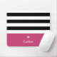 A modern wide horizontal stripes pattern mousepad in black and white and with a deep pink accent. Personalise by adding your name beneath the chic retro daisy logo.