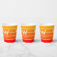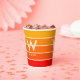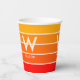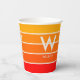 Trendy personal party paper cups featuring wide stripes in bright sunrise gradient colours. Large centred monogram and associated name. Clean, simple minimalist typography. Fully personalizable.
