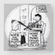 Funny cartoon clock. Man has sign saying "Wife and 3 Children to Support", alongside another man at a bar table with wine and 3 chilled beers to sup