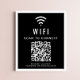 Modern and simple black poster sign to allow your customers, clients or guests to easily connect to your wifi network. Upload your wifi's QR code and add any other details, such as the network's name and password in modern white typography. Perfect for business offices, hotels, vacation rental properties, etc.