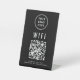 Modern and simple black table top pedestal sign to allow your customers, clients and guests to easily connect to your wifi network. Upload your QR code and logo and add any other details, such as the network name and password, in white typography.