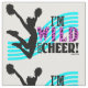 Cheerleading fabric that has a cheerleader mid-leap with pom pons in hand and the text, "I'm Wild About Cheer!". The word "Wild" has a cheetah print pattern on it.
