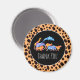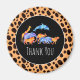 A thank you magnet designed with an exotic orange colored leopard print pattern for a background. Layered over top is a black circular frame with a white border.