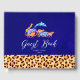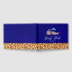 A guest book designed with an exotic orange coloured leopard print border along the bottom. Illustrated with a digital watercolor image of a herd of wild animals