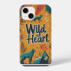 The design features the phrase "Wild at Heart" in bold, contrasting colours, set against a vibrant, abstract background inspired by wildlife. The swirling shapes and patterns evoke a sense of energy and freedom, capturing the essence of a wild spirit. The playful colour palette adds a touch of whimsy, making the design both eye-catching and expressive.
