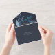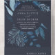 Our Wild Azure wedding invitation surrounds your wedding day details with a geometric frame of vibrant watercolor foliage. A modern yet organic choice for winter or spring weddings featuring intricately painted botanical elements. Colorway: Wild Azure, a medley of frozen blues on a navy blue background.