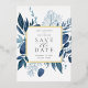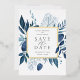 Our Winter Azure wedding save the date frames your wedding details with an elegant square border of icy watercolor foliage in shades of navy and dusty blue, with real gold foil trim on a crisp white background. A modern and elegant take on the botanical trend.