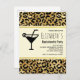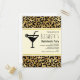 Bachelorette party invitation postcard with a stylish pattern featuring exotic leopard spots in black on a gold background. A black silhouette martini glass adds a party flair to the design. A cream coloured rectangle frame with a faux gold foil border layered over top with your personalised text inside.