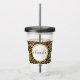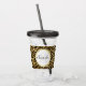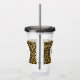 An acrylic tumbler with a stylish pattern. Exotic black leopard spots on a gold background. Wild yet elegant style. Layered over top is a white circle frame with a faux gold foil border, with your personalised monogram initial and name inside.