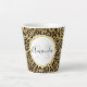 A latte mug with a stylish pattern. Exotic black leopard spots on a gold background. Wild yet elegant style. Layered over top is a white circle frame with a faux gold foil border, with your personalised monogram initial and name inside.