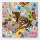 A baby deer fawn snuggled up to wild flowers and mushrooms in a backdrop of green