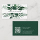 Chic botanical business cards feature your name or company name flanked by a top and bottom border of painted watercolor botanical leaves in rich shades of hunter and forest green. Add your full contact information to the back in white on coordinating dark green, along with a customisable QR code.
