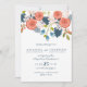 A lovely illustration adorns this Spring or Summer garden themed wedding invitation that is adorned with apricot and coral ranunculus flowers, blush and pink cherry blossoms, blue floral buds and assorted greenery. Apricot and blue colour scheme is trendy and contemporary. Available in several different typography styles as well.