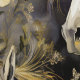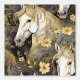 Watercolor wild horses with flowing manes and flowers in gold on charcoal black background.