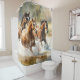 Shower curtain with a beautiful watercolor painting of 3 wild horses running through a stream of water.