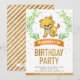 Amaze your guests with this cute lion theme birthday party invitation featuring an adorable little cub and beautiful green leaves with vibrant typography on a white background. Simply add your event details on this easy-to-use template to make it a one-of-a-kind invitation. Flip the card over to reveal a faux gold glitter stripes pattern on the back of the card.