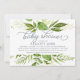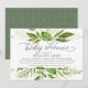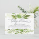 Modern green botanical baby shower invitation features a top and bottom border of lush watercolor greenery in shades of forest and fern green, with decorative typography accents and smoky blue grey lettering. Personalise this gender neutral design with your desired baby shower invitation wording using the template fields. Designed to coordinate with our Wild Meadow invitation and stationery collection.