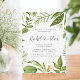 Our elegant Wild Meadow engagement party invitation features your party details in grey block and calligraphy script lettering, framed by painted watercolor greenery in lush shades of spring green, olive and fern. A modern yet organic choice for spring or summer engagement parties featuring fresh green leaves and stems in Greenery, 2017's colour of the year.